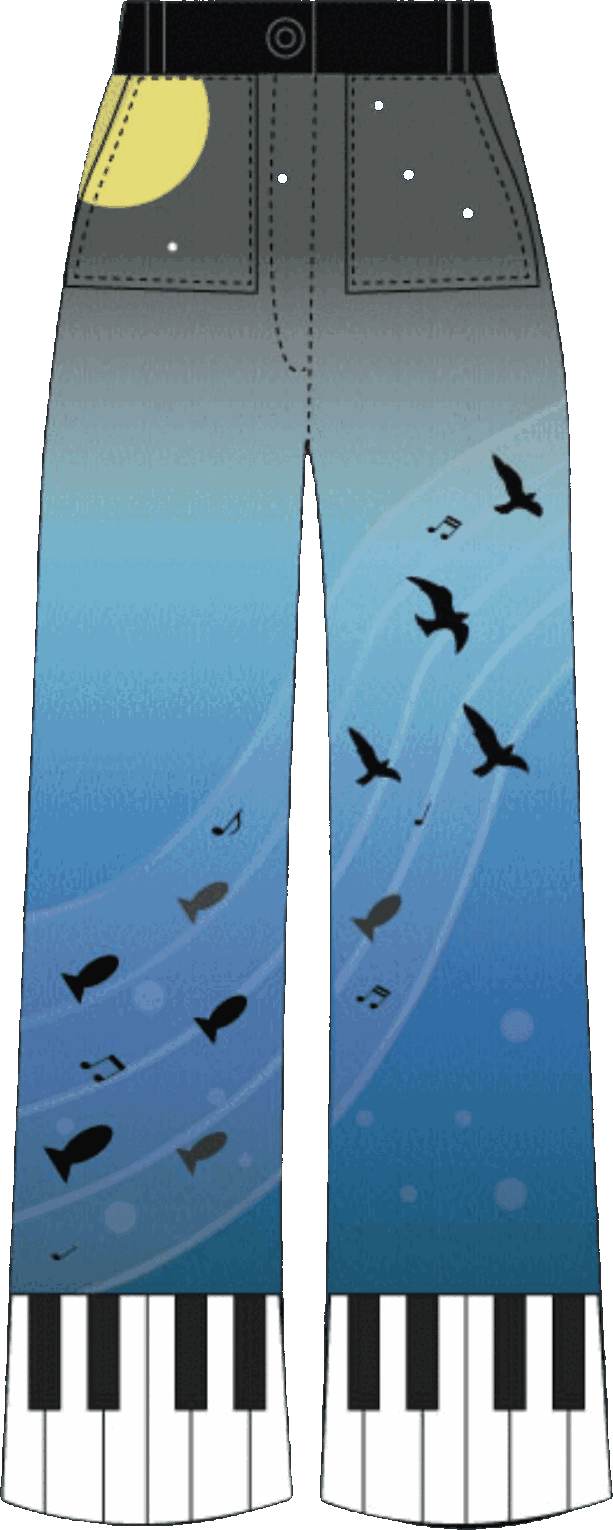 深海から空へと移り変わる色彩と音の流れを表現したパンツデザイン